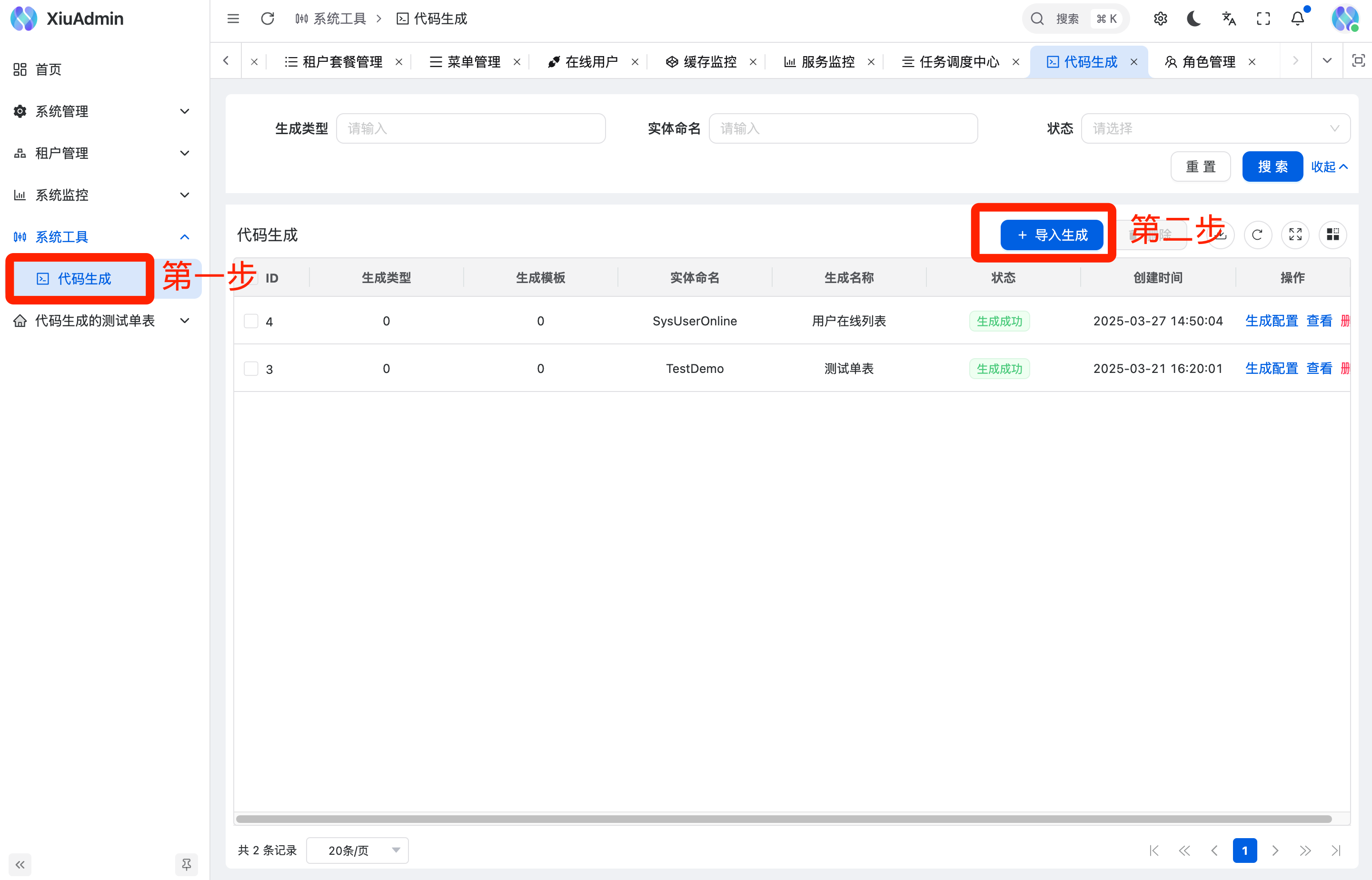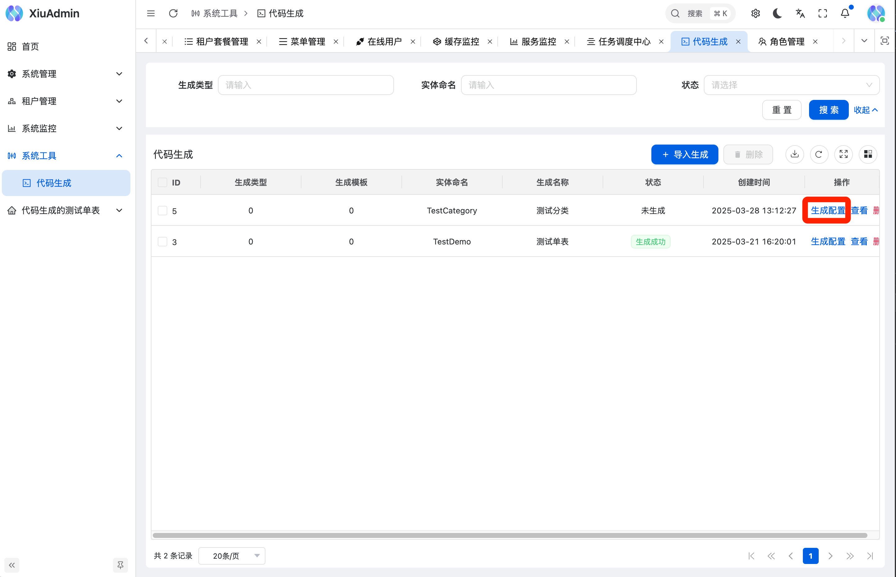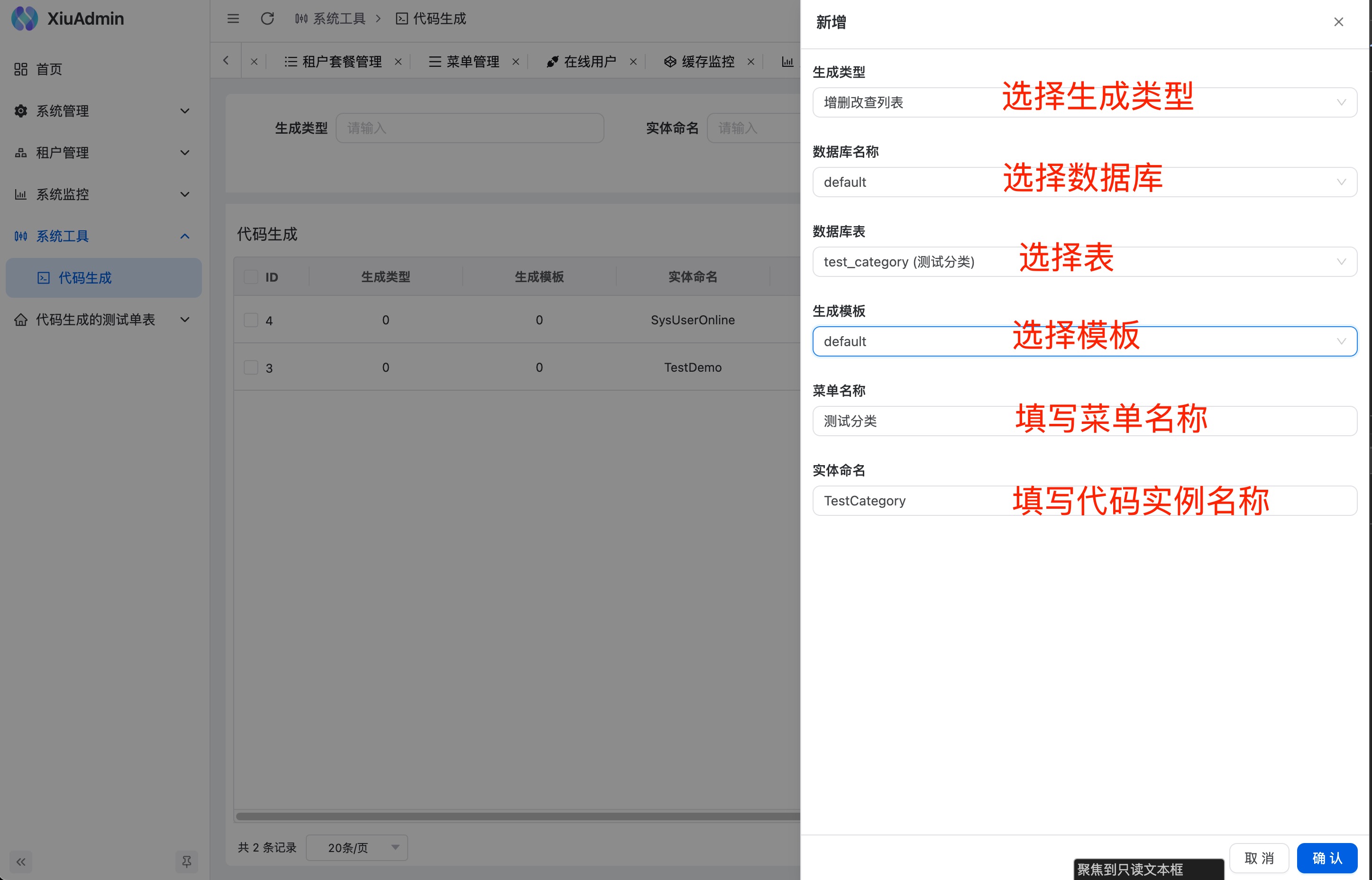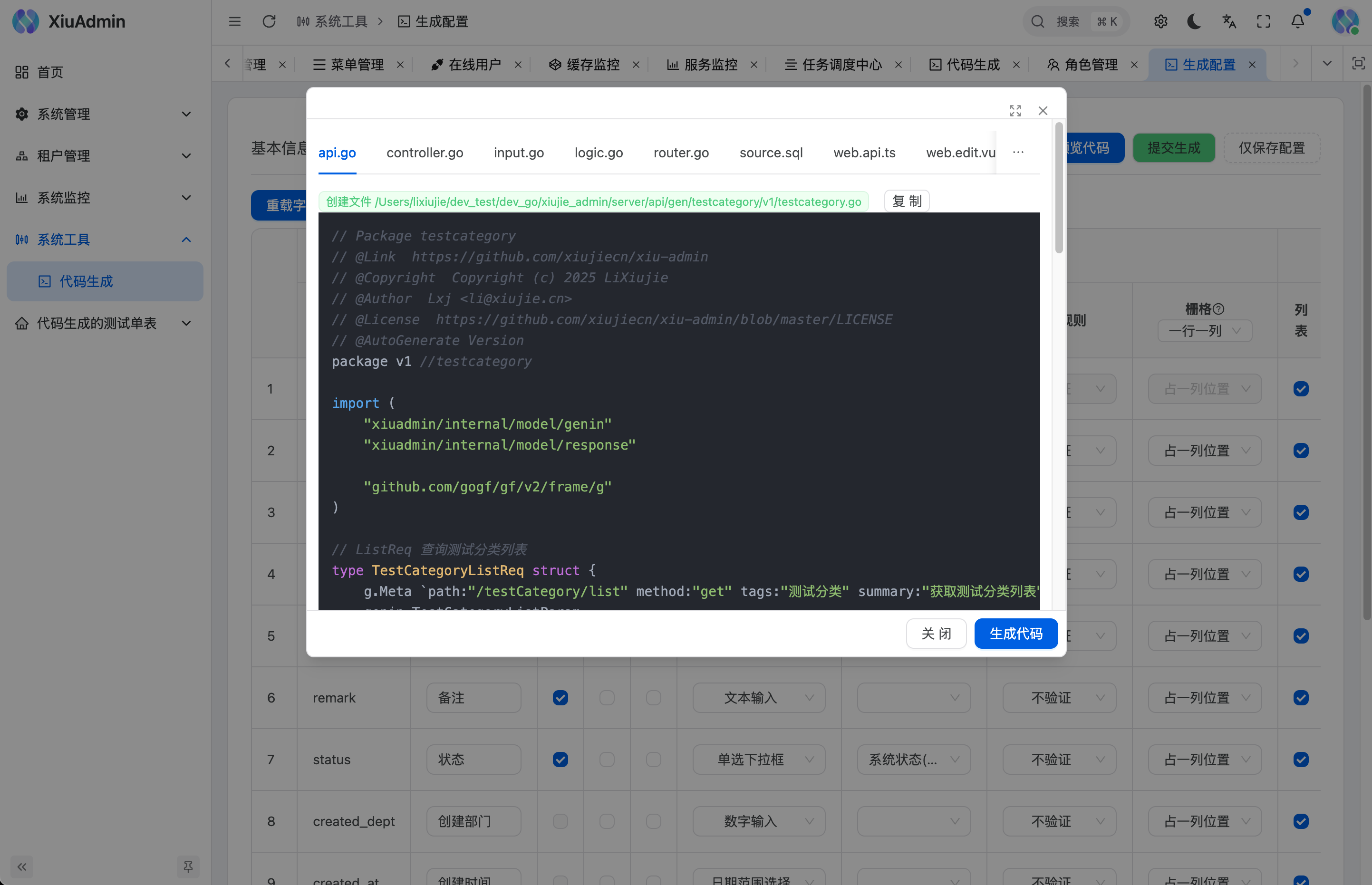 - 登录XiuAdmin后台 -> 系统工具 -> 代码生成 -> 找到立即生成按钮并打开,选择和填写如下参数: