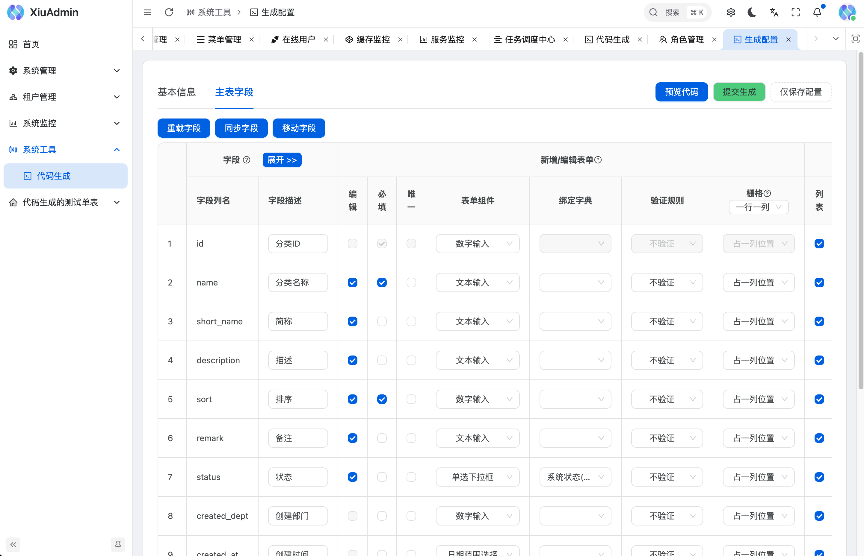 - 在该页面你可以调整生成表格字段名称、表单组件、表单编辑/验证项、列表展示/查询项、字段排序、重置和同步字段