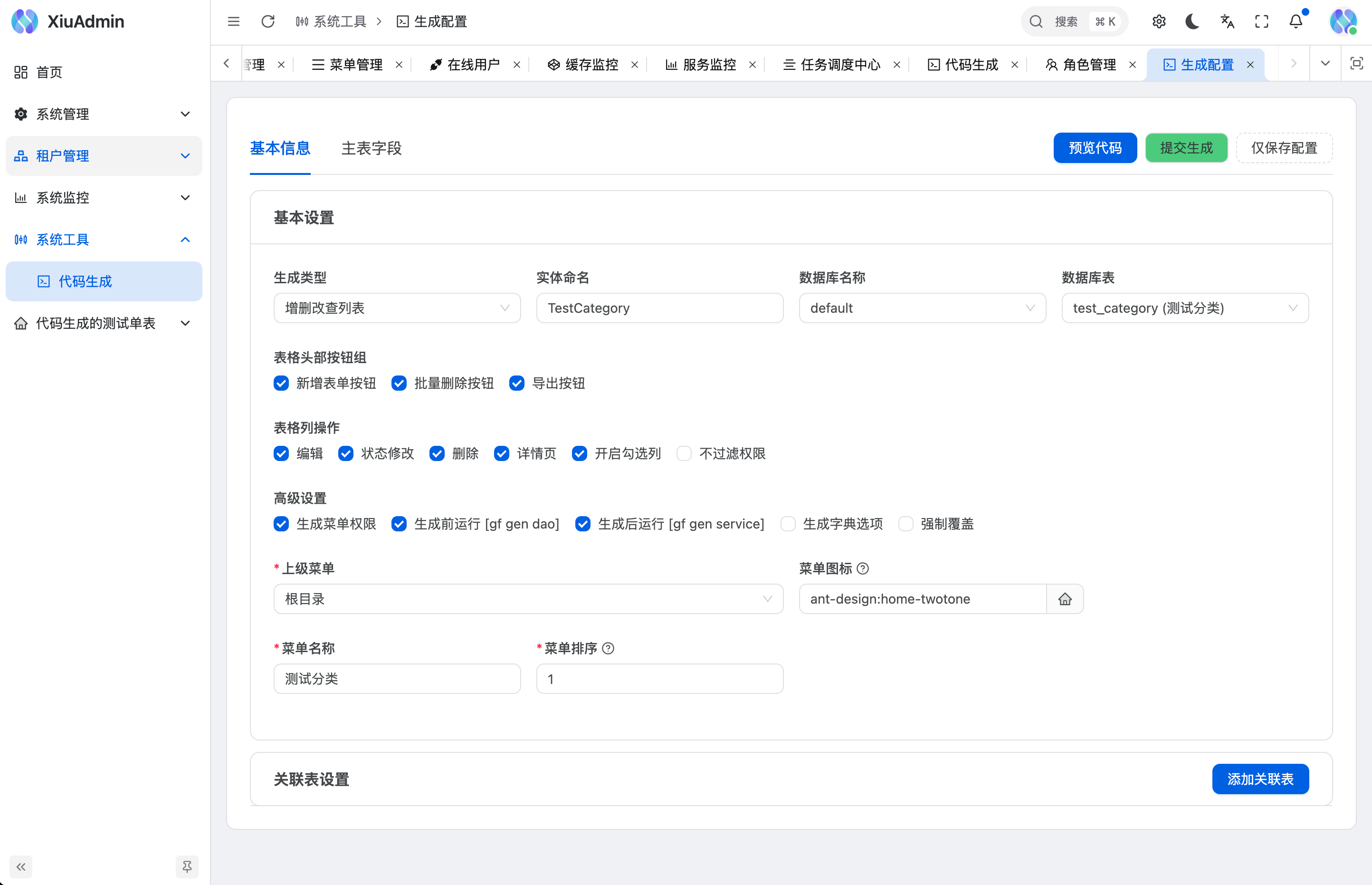 - 你可以在该页面调整生成表格表头/表列的接口功能、菜单权限、高级设置和关联表设置